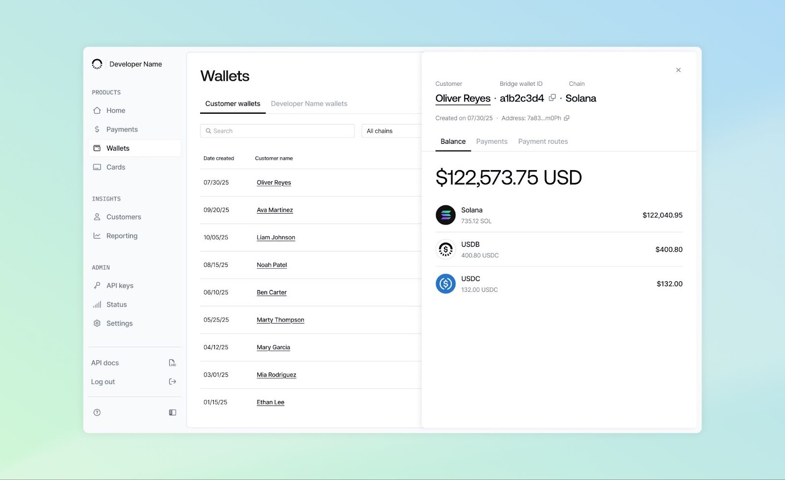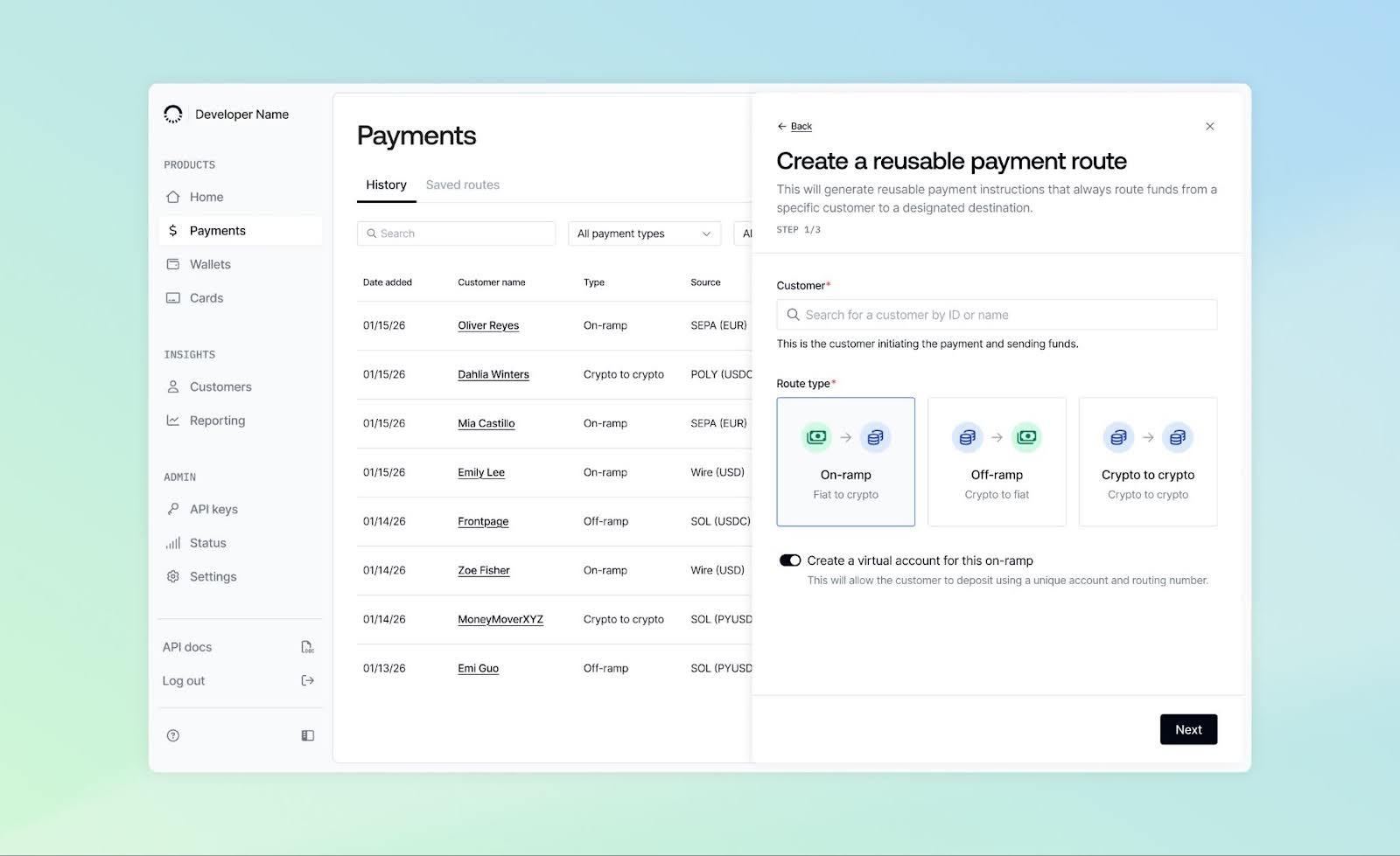 • Enable same-name payouts (starting with USD wires), allowing developers to choose what name appears on customer receipts