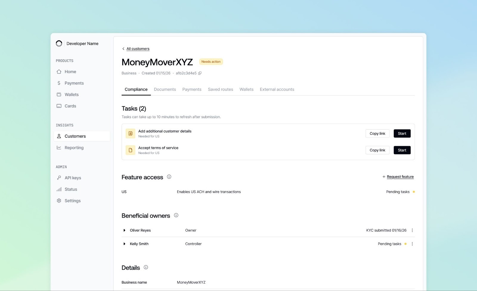 Compliance workflows that previously lived in external tools have moved directly into the Dashboard, giving developers more transparency, control, and efficiency when onboarding customers.